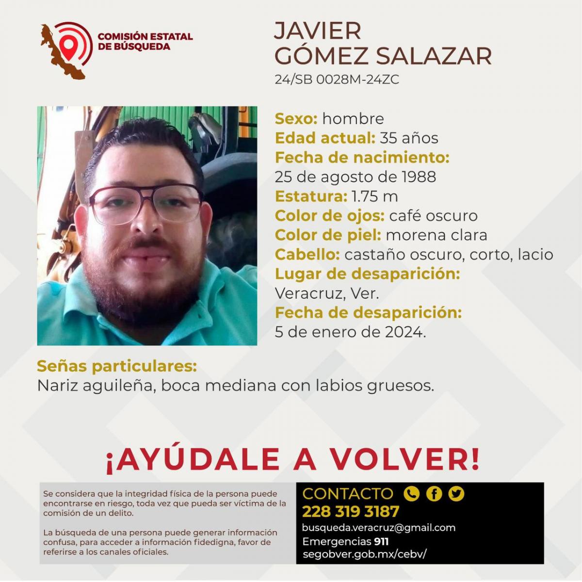 Sus familiares, desesperados, han iniciado una campaña a través de redes sociales para dar con su paradero.Javier Gómez Salazar, es de tez morena clara, tiene ojos color café oscuro y cabello castaño oscuro, corto y lacio. Como señas particulares, tiene nariz aguileña, boca mediana con labios gruesos.