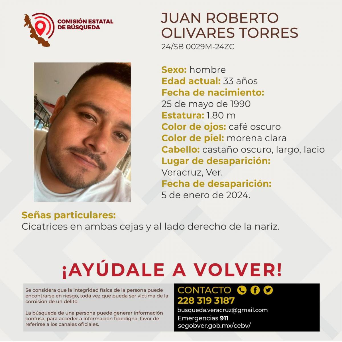 Juan Roberto Olivares Torres es de tez morena clara, ojos café oscuro, cabello largo, lacio y café oscuro, y como señas particulares tiene cicatrices en ambas cejas y a un lado de la nariz. Cualquier información que ayude a dar con su paradero, se pide reportarla al 911 o al 228 319 3187.