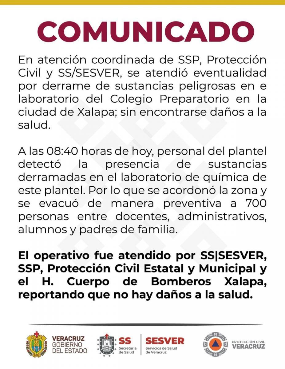 Derivado del incidente se conoció que los bomberos realizaron una limpieza en la zona donde el químico se regó con apoyo de mangueras especiales para estos casos. Por esta eventualidad no se reportaron heridos. Los alumnos fueron evacuados rumbo a la calle Clavijero, en lo que las autoridades limpiaban el peligroso químico derramado.