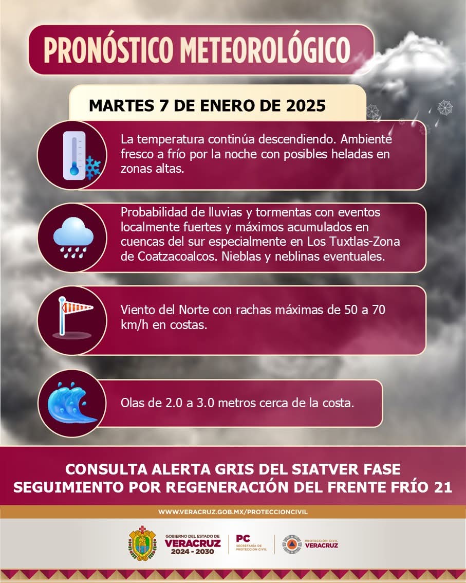 De acuerdo con la Secretaría de Protección Civil Estatal se mantiene activa la Alerta Gris pues en el transcurso de este martes 7 de enero se prevén rachas de entre 50 y 70 Kilómetros por hora.