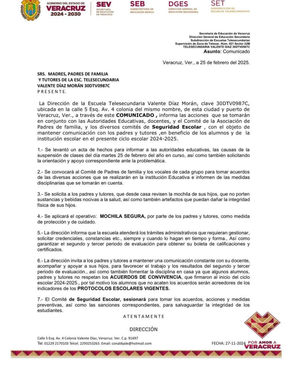 Además, el Comité de Seguridad Escolar sesionará para definir acciones preventivas y sanciones necesarias para garantizar la integridad de la comunidad educativa. La SEV reiteró su compromiso con el bienestar de los estudiantes e instó a los padres a mantener una comunicación constante con los docentes.