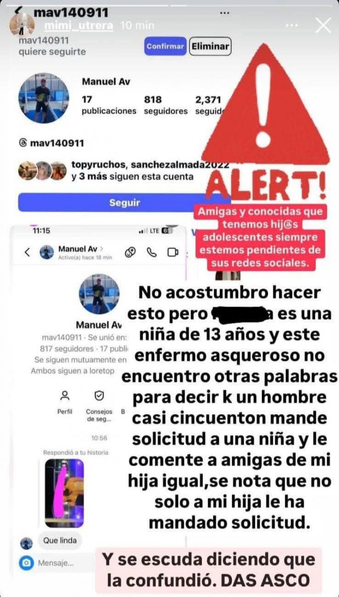 “No acostumbro a hacer esto, pero es una niña de 13 años y este enfermo asqueroso, no encuentro otras palabras para decir que un hombre casi cincuentón, mande solicitud a una niña y le comente a sus amigas de mi hija igual, se nota que no solo a mi hija le ha mandado solicitud”, escribió la madre de la menor en una historia de Instagram.