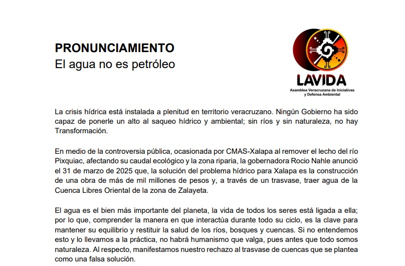 “La crisis hídrica está instalada a plenitud en territorio veracruzano. Ningún gobierno ha sido capaz de ponerle un alto al saqueo hídrico y ambiental; sin ríos y sin naturaleza, no hay transformación”, refiere el comunicado del grupo ambientalista.