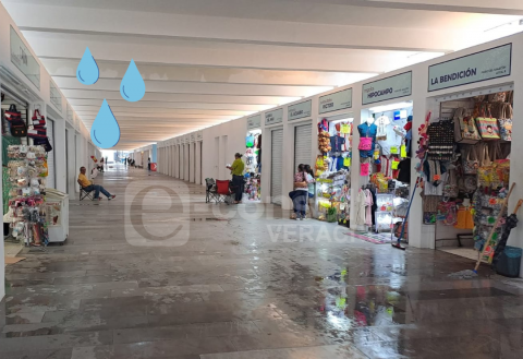 Graciela Pastrana, locataria de la plaza Heroísmo Veracruzano, contó que más de 10 locales del recién remodelado sitio resultaron afectados con filtraciones de agua y goteras ante las recientes lluvias que dejó el huracán Erick.