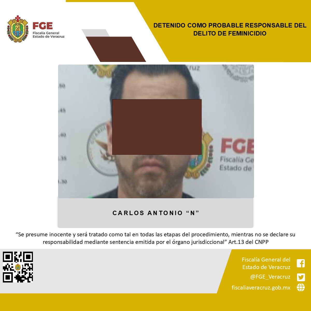 “La Fiscalía General del Estado informa que, elementos de la Policía Ministerial cumplimentaron, en el municipio de Banderilla, una orden de aprehensión en contra de Carlos Antonio “N” como probable responsable del delito de feminicidio, en agravio de la víctima identificada con las iniciales L.A.S.A.”, señala el comunicado de la FGE.