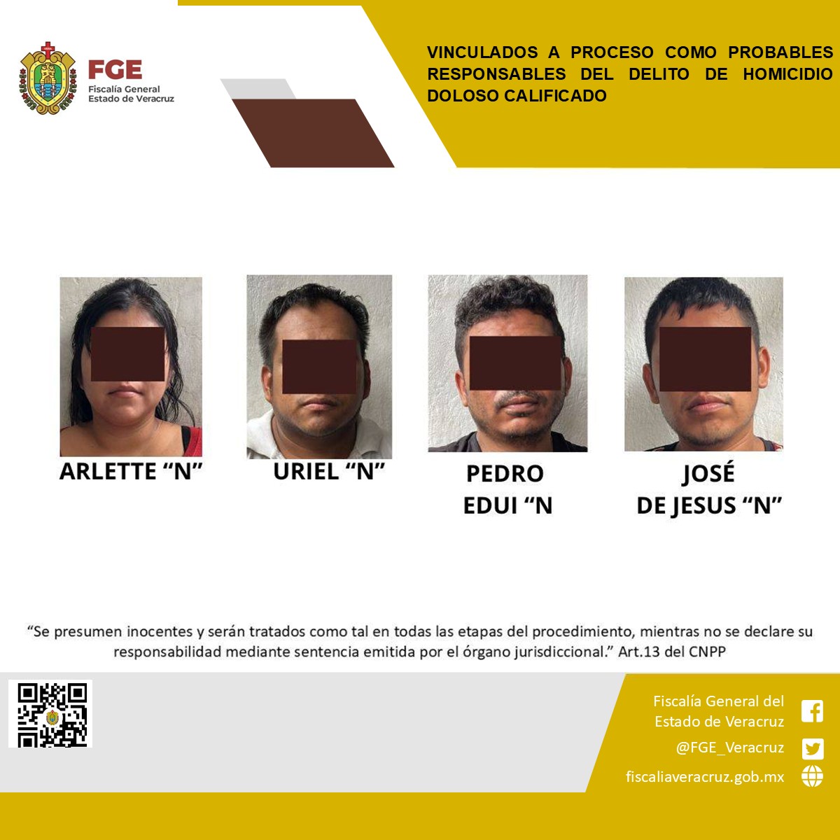 De acuerdo con el boletín oficial, se trata de José de Jesús “N”, Uriel “N”, Arlette “N” y Pedro Eduin “N”, quienes serían integrantes del Cártel de Jalisco Nueva Generación (CJNG). Las investigaciones señalan que el crimen, perpetrado el pasado 8 de abril, podría estar vinculado a Abraham “N”, alias “El Doble Cero”.