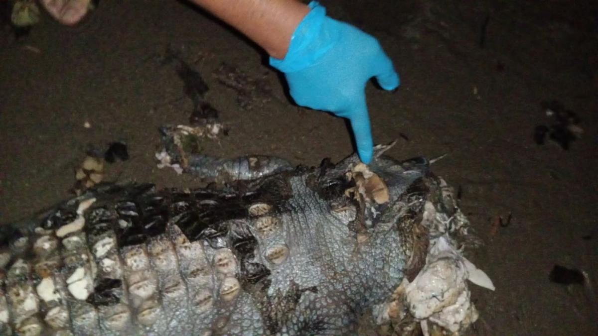 “El corte se ve muy preciso. Lo más probable es que haya sido causado por la hélice de una lancha o barco”, explicó el ambientalista Alex Cepeda, quien acudió al sitio y manipuló los restos del cocodrilo.