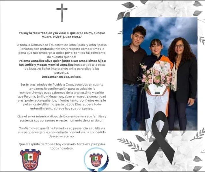 Xalapa, Ver.- A través de redes sociales, la comunidad educativa del colegio John Spark y del John Sparks Poniente de la ciudad de Coatzacoalcos, lamentó el fallecimiento de la maestra Paloma González Silva y de sus hijos Ian Emilio y Megan Montiel González, quienes perdieron la vida por intoxicación tras inhalar monóxido de carbono al interior de un departamento ubicado en la capital del estado de Puebla.