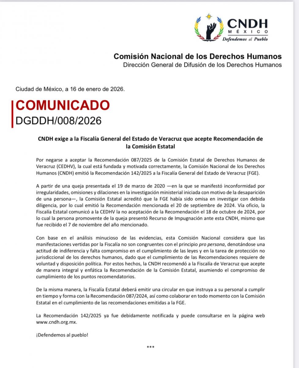 A través de la recomendación 142/2025, la CNDH ordenó a la Fiscalía de Veracruz aceptar de manera integral y enfática el expediente 87/2025 emitido por la CEDH, relacionado con omisiones, dilaciones e irregularidades en una investigación por desaparición de persona iniciada desde marzo de 2020.