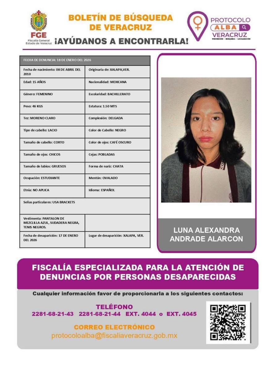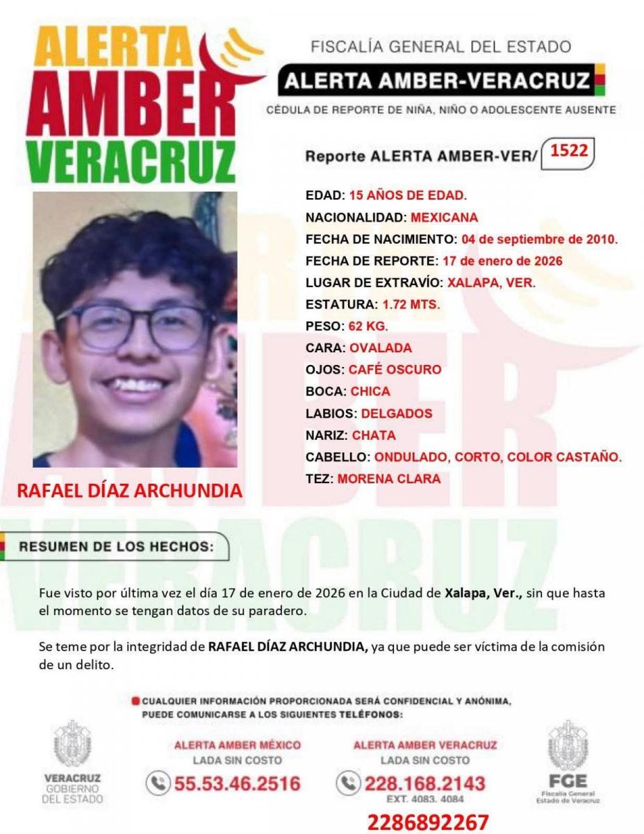 Xalapa, Ver.- Rafael Díaz Archundia y Alexandra Andrade Alarcón, dos adolescentes menores de 15 años, fueron reportados como desaparecidos desde el día 17 de enero del 2026. Ambos en la ciudad de Xalapa, Veracruz.