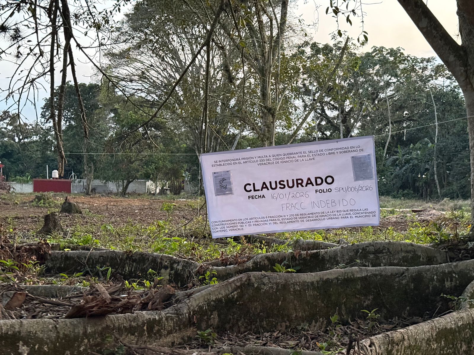 Con base en los artículos 6 fracción III y 270 del Reglamento de la Ley 823, en correlación con los artículos 130 y 131 fracción VI del Reglamento de Desarrollo Urbano del municipio, el 16 de enero de 2026 se ordenó la clausura inmediata del predio.