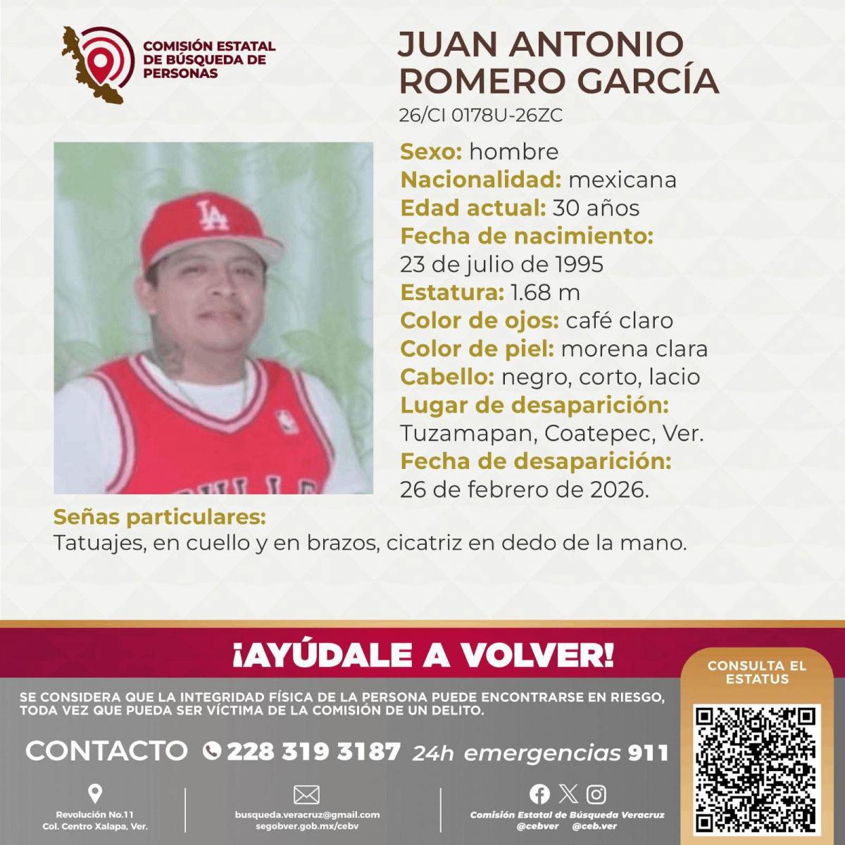 De acuerdo con la ficha de búsqueda emitida tras su desaparición, Juan Antonio Romero García fue visto por última vez en Tuzamapan, Coatepec, el 26 de febrero de 2026, lo que llevó a sus familiares a solicitar apoyo para su localización.