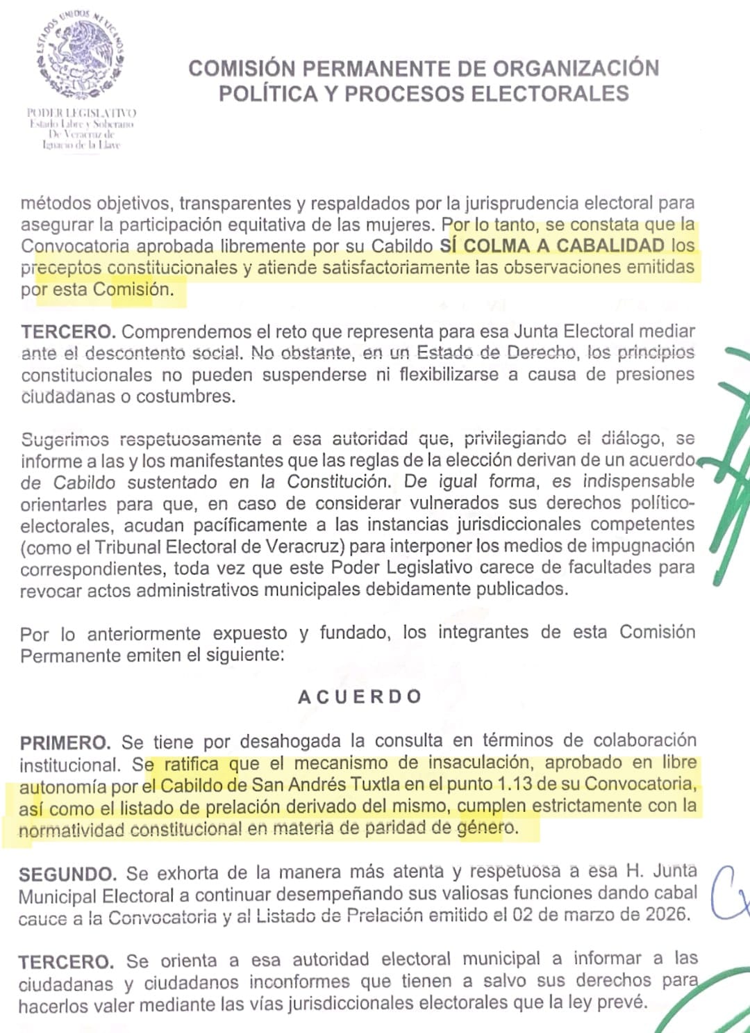 San Andrés Tuxtla, Ver., 7 de marzo de 2026.- En atención a las inquietudes expuestas por habitantes de comunidades de San Andrés Tuxtla, la Junta Municipal Electoral del H. Ayuntamiento solicitó al Congreso del Estado de Veracruz criterio orientador respecto a la Convocatoria aprobada por la autoridad municipal en sesión de cabildo en febrero del año en curso, en la que se garantiza los principios de paridad de género para la elección de agentes y subagentes municipales 2026.
