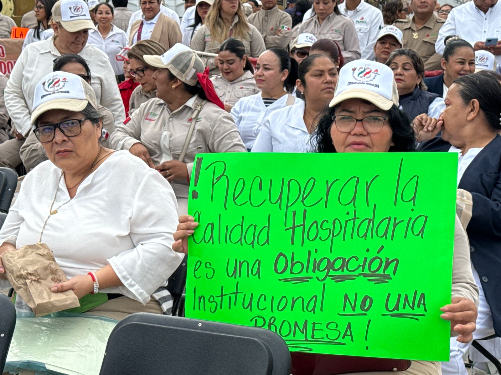 Una de las trabajadoras portaba una cartulina con el mensaje: “Recuperar la calidad hospitalaria es una obligación institucional, no una promesa”.