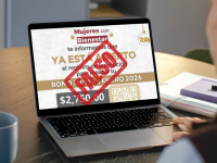 Alertan por falso bono del Bienestar para mujeres que circula en redes Iraís GarcíaLunes, Enero 12, 2026 - 15:46Autoridades alertan por un falso bono para mujeres difundido en redes, que suplanta programas del Bienestar para robar datos personales.Leer más