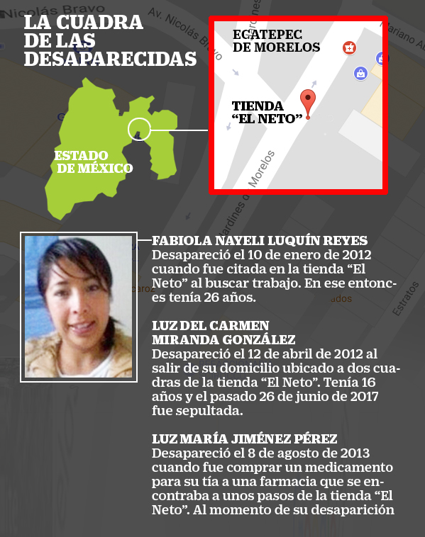 La colonia Jardines de Morelos ubicada en el municipio de Ecatepec, de acuerdo a expertos del C5 es una de las 23 colonias más riesgosas del Estado de México y dentro de dicha colonia, en la Avenida Jardines de Morelos, tres mujeres desaparecieron en el lapso de un año.