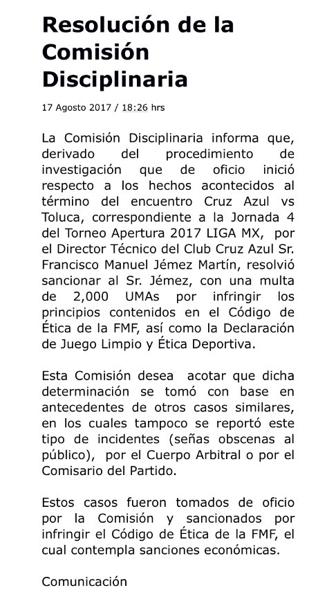 Francisco Jémez fue suspendido con un partido, después de ser expulsado en el juego de la Copa MX entre Cruz Azul y Zacatepec (1-0), la sanción fue por “hacer constantes reclamaciones o protestar las decisiones” de los árbitros. Además se le impuso multa por seña obscena.