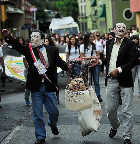 Algunos hicieron uso de máscaras que representaban al presidente de la República, Enrique Peña Nieto, y al ex presidente Carlos Salinas de Gortari. A su vez, mostraron los logotipos de las televisoras, Televisa y Tv Azteca para expresar su repudio hacia ellas.