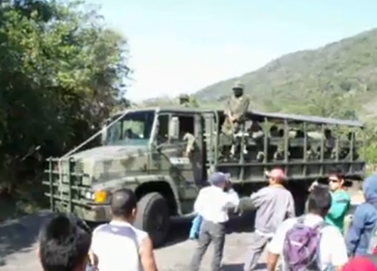 Un vehículo del Ejército Mexicano tuvo que retroceder porque el paso le fue impedido por los manifestantes al proyecto que, aseguran, perjudica a toda la cuenca de la Antigua.