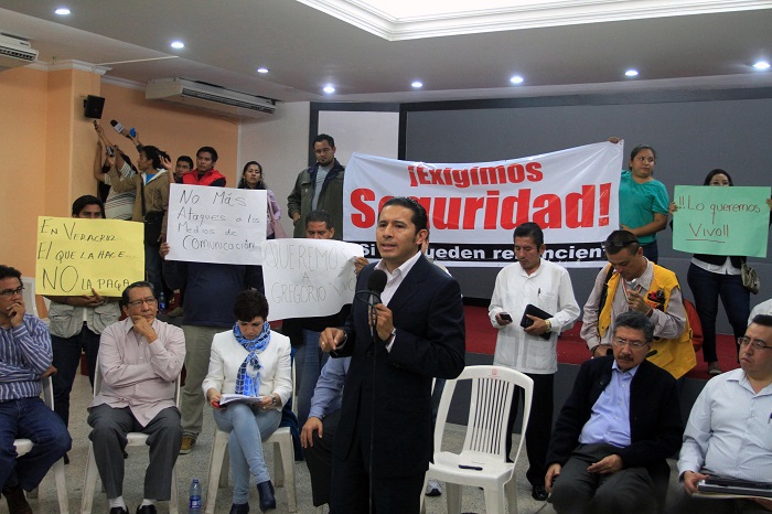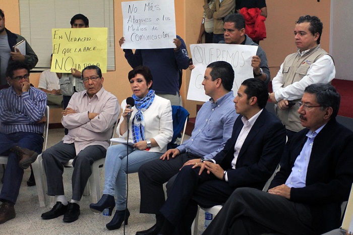 Los periodistas que interrumpieron el unisolo de los funcionarios, tomaron la palabra para expresar su sentir sobre las agresiones a periodistas que hasta el momento han dejado más de nueve periodistas muertos, y varios desaparecidos.