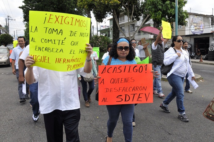El secretario general del SDTEV, Miguel Hernández Plascencia, pidió que se proceda penalmente en contra de los ex líderes de la organización sindical: Gilberto Estrada Ibarra, Rafael Sánchez, José Eduardo Hernández, Cirilo Pérez Reyes, Enrique Cruz Canseco y Adolfo Campos Lorenzo, por un fraude millonario.