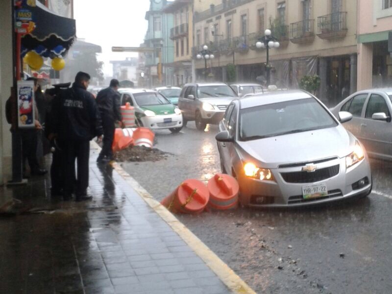 Lluvia desplaza señalética, y vehículos caen a hoyos abiertos por CMAS-Xalapa