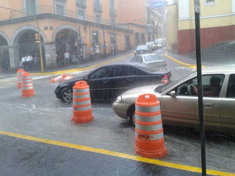 La fuerte lluvias que se registró la tarde del sábado en la capital del estado, generó fuertes encharcamientos en el primer cuadro de la ciudad.