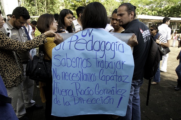 Maestros de la facultad de Pedagogía de al Universidad Veracruzana se manifiestaron en la inauguración del ciclo escolar 2014-2015, que encabezó la rectora de la casa de estudios, Sara Ladrón de Guevara, en el Gimnasio Universitario, ubicado en la ciudad de Xalapa.