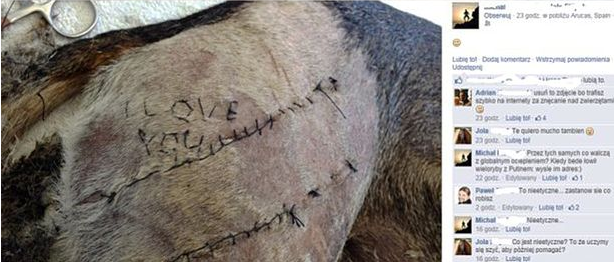 “I love you” eso es lo que se puede leer en los puntos de sutura de un perro, al que un estudiante de veterinaria polaco decidió utilizar como soporte para su declaración de amor.