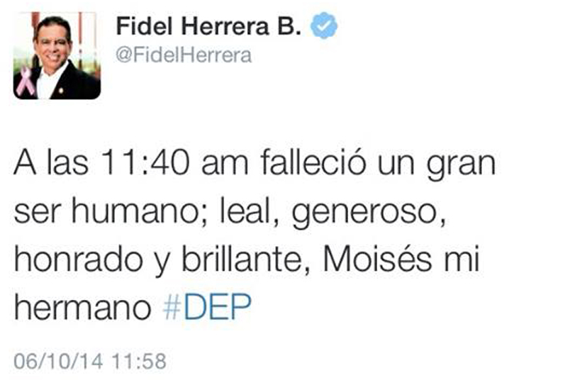 @FidelHerrera: "A las 11:40 am falleció un gran ser humano; leal, generoso, honrado y brillante, Moisés mi hermano #DEP"