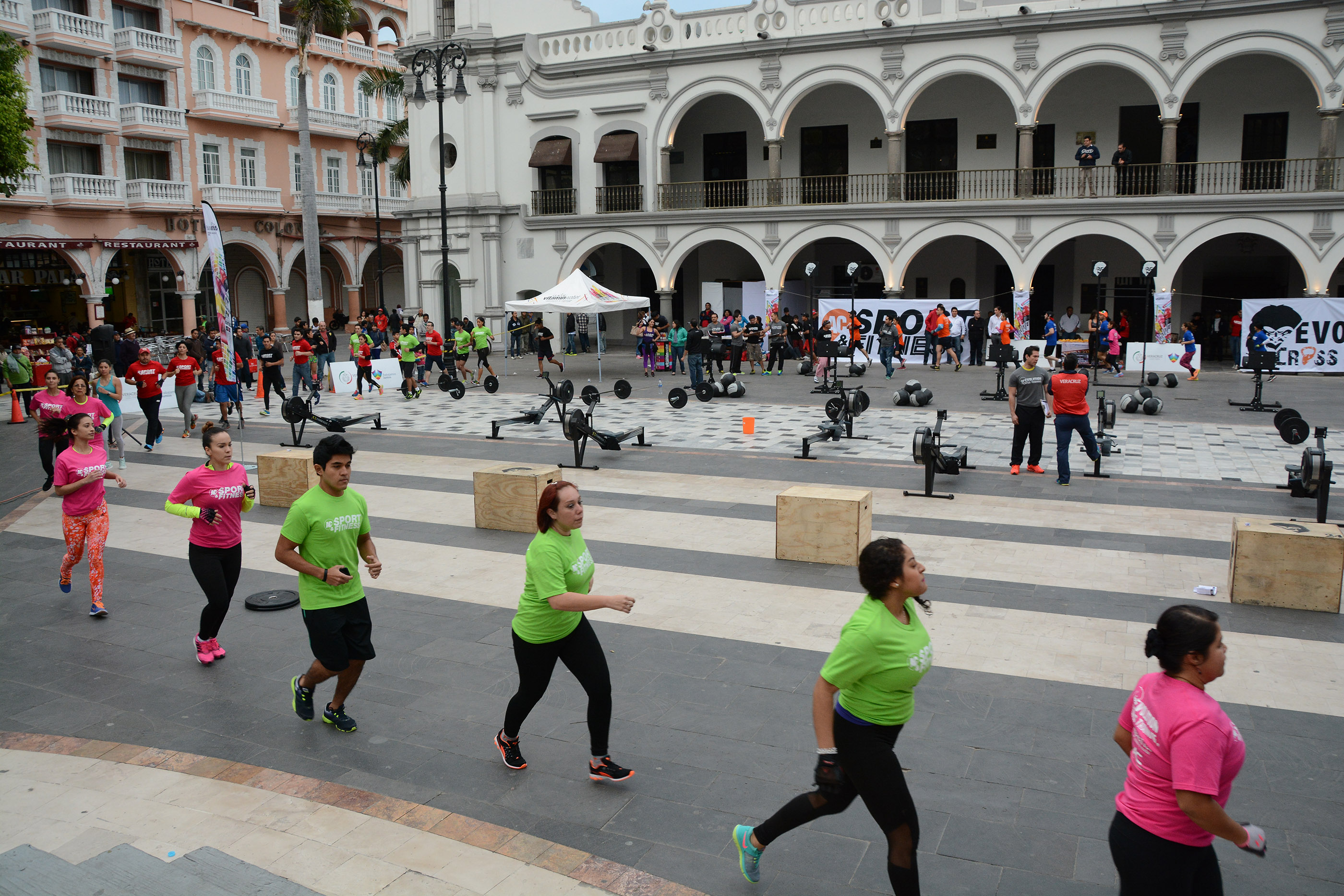 Veracruz, Ver.-Buscando innovar, para brindar nuevas experiencias y diferentes opciones de ejercicio y activación, el Gobierno Municipal de Veracruz, mediante la Dirección del Deporte; llevó a cabo esta tarde una clase masiva de Cross Fit, de manera gratuita en el Zócalo de Veracruz, con la participación de 200 personas.