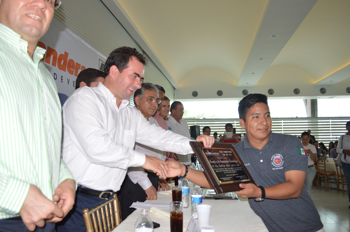 Pepe Yunes también asistió al festejo por el octavo aniversario de la empresa Gas Banderas, que entregó premios a la innovación tecnológica a estudiantes del Tecnológico de Poza Rica, quienes son campeones mundiales en robótica.