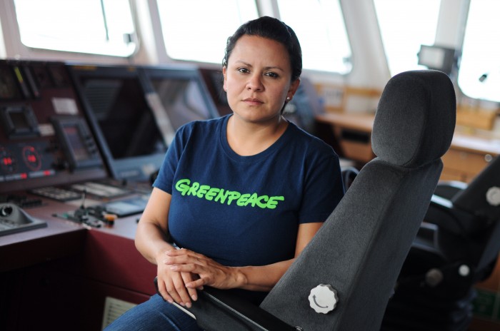 Ella estaba allí el sábado 1 de marzo de 2014. Javier Duarte de Ochoa iba a inaugurar el Carnaval de Veracruz y tocarían Los Tigres del Norte cuando, a las 5 de la tarde, seis activistas de la organización aguadaron su fiesta. Ingresaron a la Torre de Pemex del puerto para colocar una manta con aquella vergonzosa portada de Time, la de Peña Nieto “salvando a México”. El “banner” (como le llaman en Greenpeace) agregaba un signo de interrogación al final: “Saving Mexico?”. El Presidente aparecía chorreando petróleo.