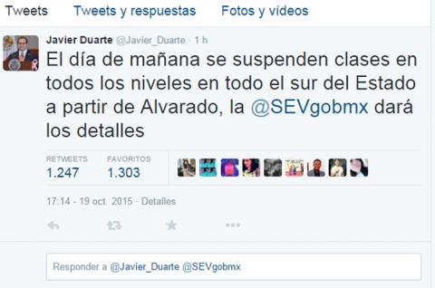Xalapa, Ver.- A través de su cuenta de Twitter, el gobernador del estado, Javier Duarte de Ochoa, informó a que se suspenderán clases en todos los niveles educativos de la zona sur del estado, a partir del municipio de Alvarado.
