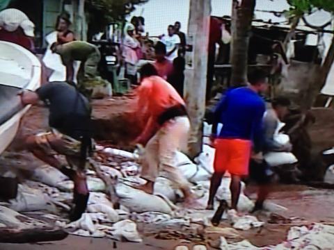 Ante los desveles y socavamientos, el personal de las fuerzas armadas colocan un gran número de sacos de arena, toda vez que se carece de un muro de contención el cual evite la afectación en las viviendas.
