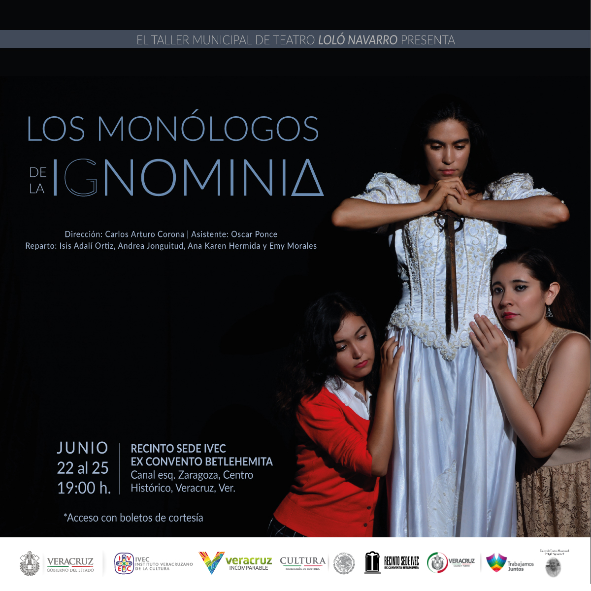 Veracruz, Ver., 15 de junio de 2016.- Con el respaldo de la Secretaría de Cultura y el Ayuntamiento de Veracruz, el Taller de Teatro Municipal de Veracruz Loló Navarropresentará la obra Los monólogos de la ignominia, del 22 al 25 de junio en el auditorio del recinto sede, con entrada gratuita para el público.