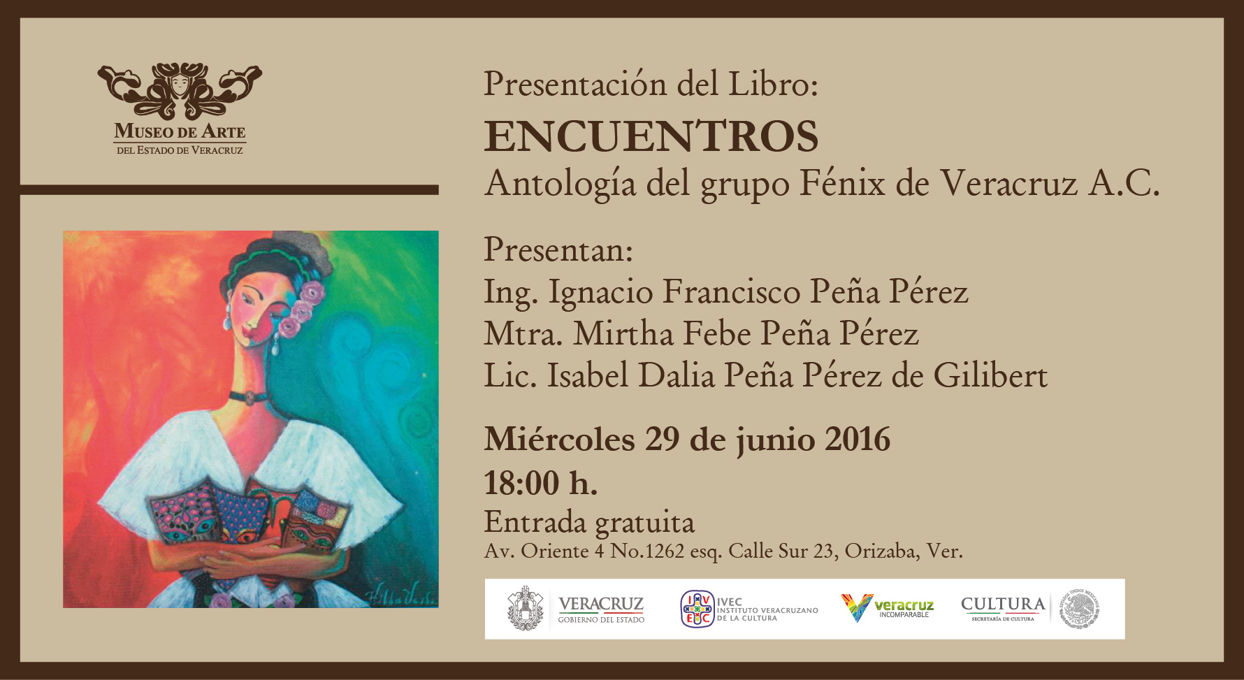 La cita para conocer Encuentros es este miércoles 29 de junio a las 18:00 horas, en el Antiguo Oratorio de San Felipe Neri, sede del Museo de Arte del Estado de Veracruz, en la ciudad de Orizaba, ubicado en Oriente 4 número 1262 esquina Sur 23 y 25, colonia Centro.