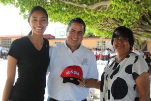 Por último se trasladó a la primaria Adrián Zamora López, donde fue recibido con porras y con muestras de cariño por parte del alumnado; además la volibolista oriunda de Coatzacoalcos, Itzel Santoyo, le obsequió una gorra conmemorativa a su participación en el torneo en el que participó recientemente en Rusia.