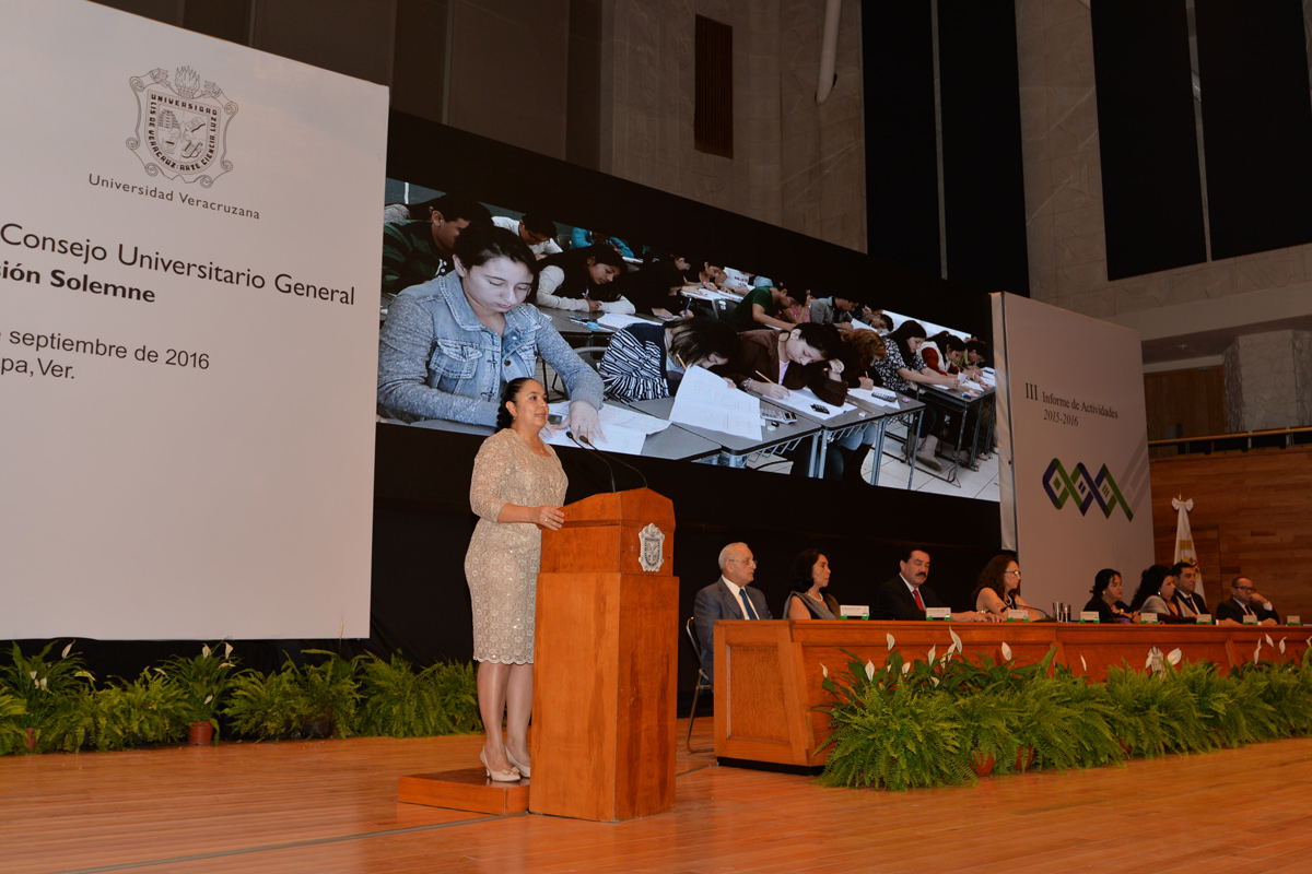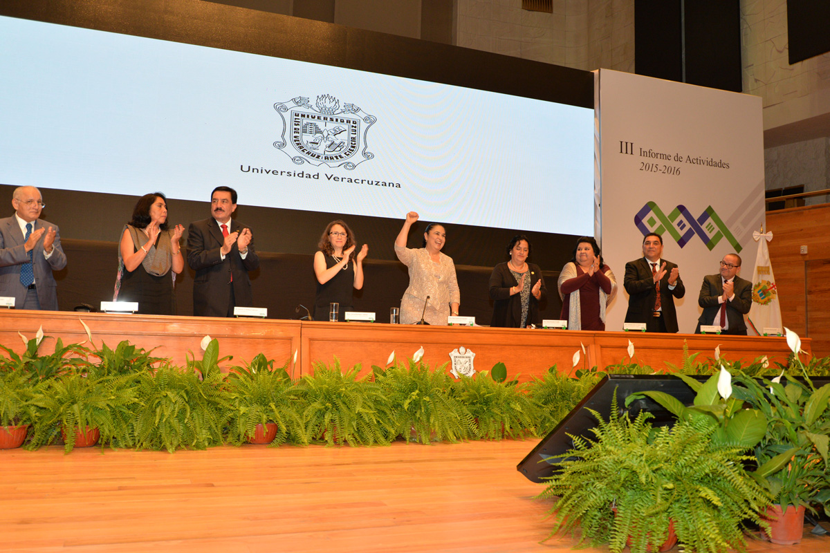 En medio de una complicada situación económica y social, la Universidad Veracruzana (UV) ha logrado que el 90 por ciento de su matrícula curse programas educativos de calidad avalados a nivel nacional, expresó la rectora Sara Ladrón de Guevara al presentar su Tercer Informe de Actividades 2015-2016 en la Sala de Conciertos del Complejo Cultural Tlaqná, el lunes 5 de septiembre.