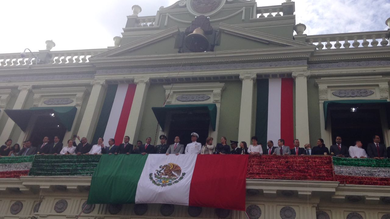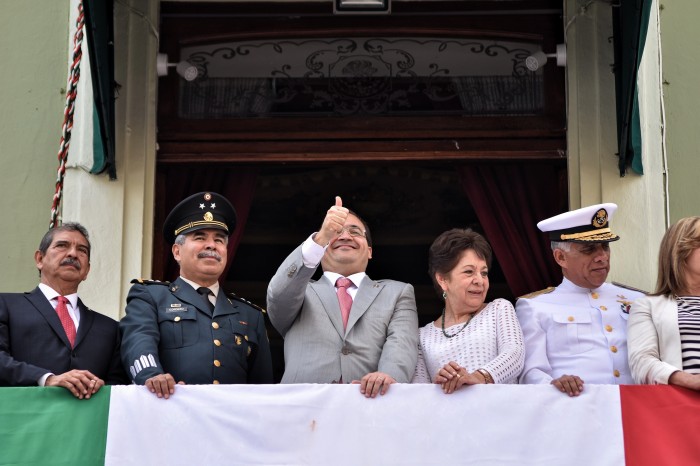Ahora, en la recta final de su mandato, Duarte de Ochoa ha eliminado el templete, y preside el desfile desde el balcón principal de Palacio de Gobierno que da a Plaza Lerdo.