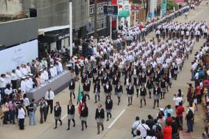 Desfilaron 39 primarias con 234 alumnos; 11 secundarias, con dos mil 360 alumnos; siete bachilleratos con mil 786 alumnos; una universidad con 100 alumnos; 50 del Pentatlón; 59 banderas; y cinco unidades de la Policía Federal.