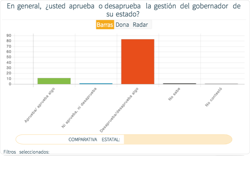 El 11.7 por ciento de los veracruzanos dijo que aprueba “algo” la gestión estatal, el 1.9 ni aprueba ni desaprueba, y el 83.6 desaprueba algo o desaprueba la gestión estatal.