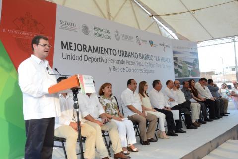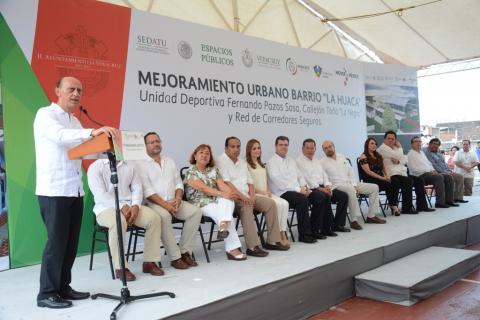 Veracruz, Ver.- En rescate del barrio más emblemático de la ciudad de Veracruz, cuya rica identidad sobrevivió el paso de hechos históricos; el Presidente Municipal, Ramón Poo Gil, anunció las obras integrales para la revitalización del Barrio de La Huaca, que comprenden la Unidad Deportiva Fernando Pazos Sosa, el callejón Toña la Negra y la Red de Corredores Seguros, con una inversión global de 41.2 millones de pesos municipales y de la Secretaría de Desarrollo Agrario, Territorial y Urbano (SEDATU); así lo informó en compañía de la Presidenta del DIF Municipal, Maricruz Barreda Cobo; así como del Subsecretario de Desarrollo Urbano y Vivienda de la SEDATU, Juan Carlos Lastiri Quirós; y el Secretario de Gobierno Estatal, Flavino Ríos Alvarado.