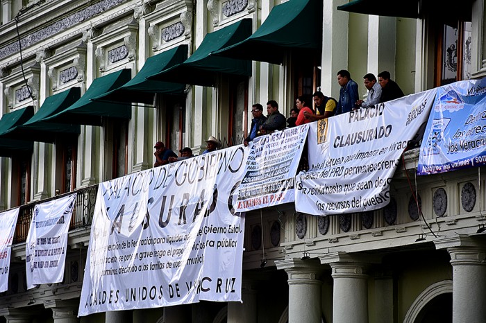 Xalapa, Ver.- El lujoso balcón de palacio de gobierno, donde el ex gobernador Javier Duarte de Ochoa presidió su último desfile cívico militar del 16 de septiembre, ahora luce lleno de lonas con letreros de reclamos porque presuntamente "robó" los seis mil millones de pesos correspondientes a las participaciones federales de los 212 ayuntamientos.
