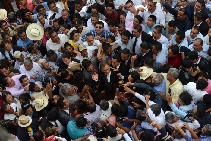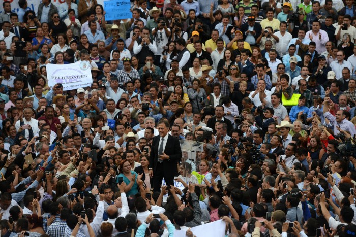 Entre gritos de ¡sí se pudo!, Miguel Ángel Yunes Linares, tomó protesta de manera simbólica ante miles de personas en Plaza Lerdo.