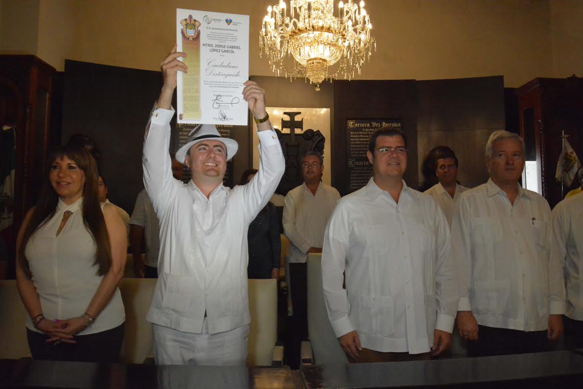 Veracruz, Ver.- El Ayuntamiento de Veracruz, encabezado por el presidente municipal Ramón Poo Gil, en sesión solemne de Cabildo nombró "Ciudadano Distinguido" a Jorge Gabriel López García, "Caribe, el poeta del puerto", por su contribución a las artes y al desarrollo cultural de esta ciudad y puerto.