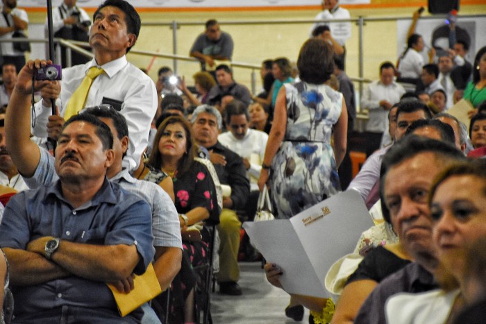 Xalapa, Ver.- Con empujones y gritos de protesta, inició el festejo con motivo del Día del Maestro presidido por Gobernador del estado en el Velódromo de la ciudad.