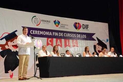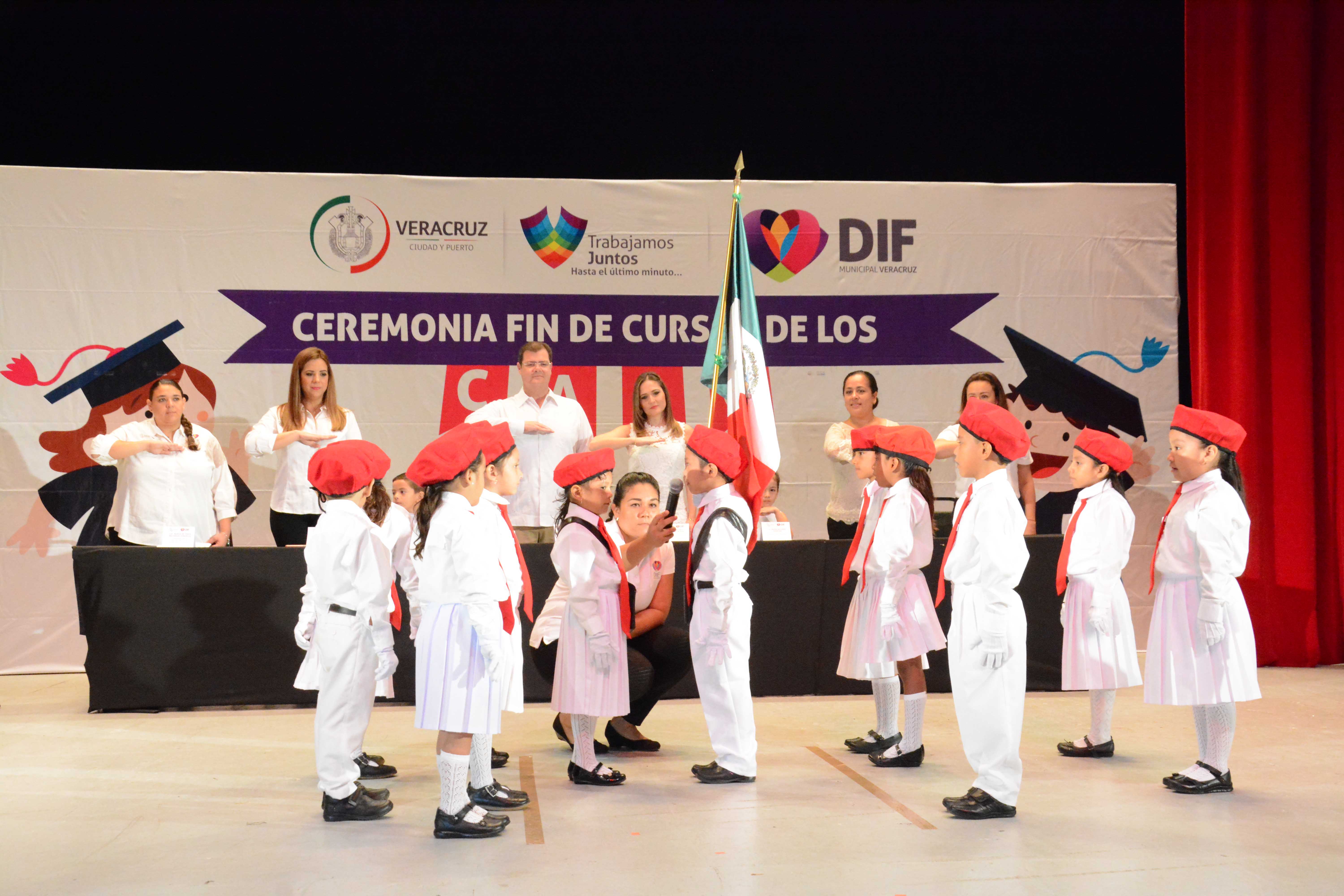 H. Veracruz, Ver. – Trabajando juntos hasta el último minuto por el bienestar educativo de las y los niños veracruzanos, el alcalde Ramón Poo Gil y la presidenta del DIF Municipal, Maricruz Barreda Cobo, encabezaron la ceremonia de fin de cursos de los Centros de Asistencia Infantil Comunitarios (CAIC) generación 2014-2017.