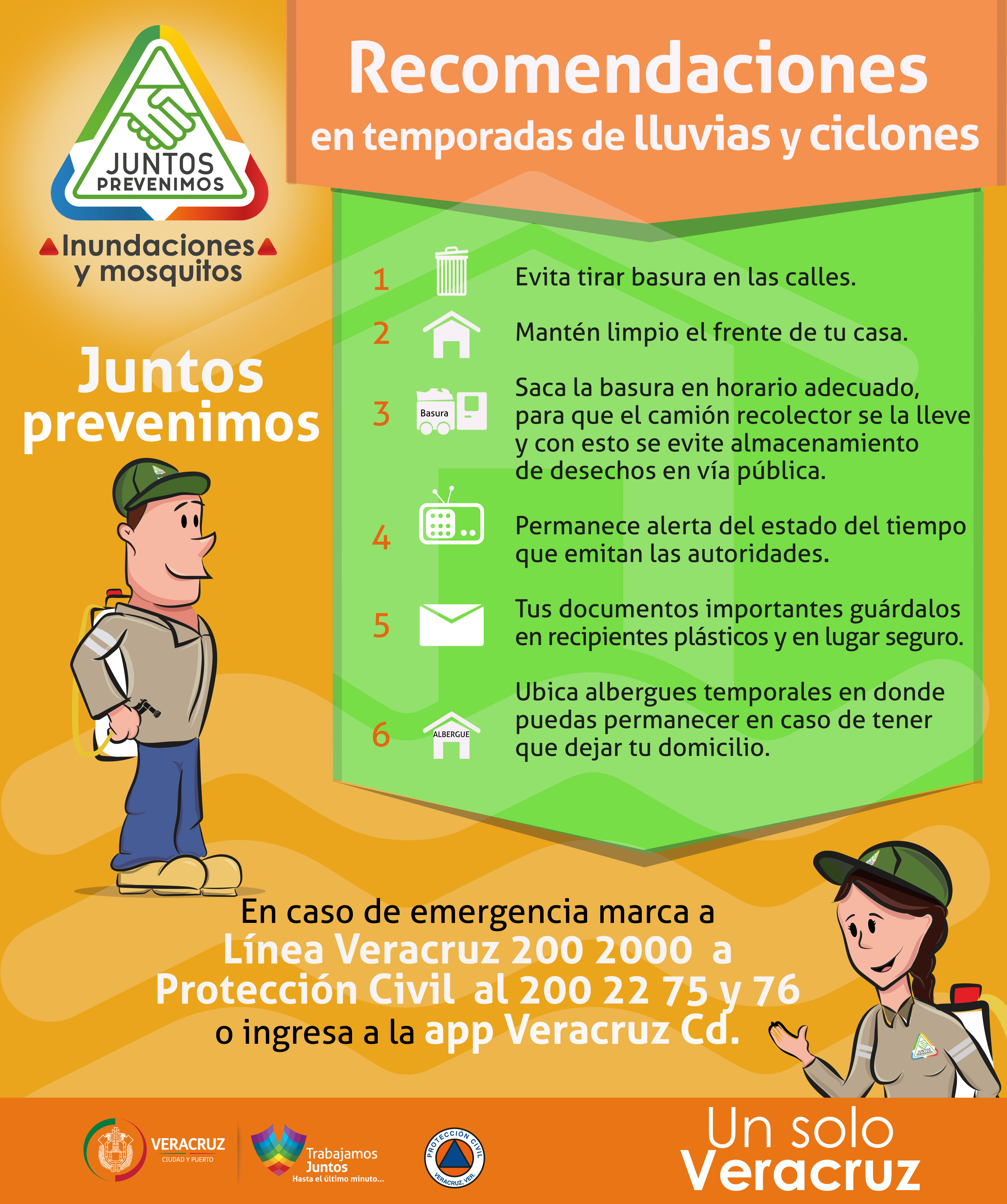 En caso de existir inundaciones, se recomienda a la población verificar que no haya agua adentro de la casa habitación, cortar el suministro de energía eléctrica y desalojar agua estancada para prevenir cualquier accidente, así como plagas, enfermedades de mosquitos e infecciones; asimismo, es importante extremar medidas de higiene en alimentos y agua, revisar instalaciones eléctricas y de gas, así como caminar con precaución en caso de haber calles inundadas.