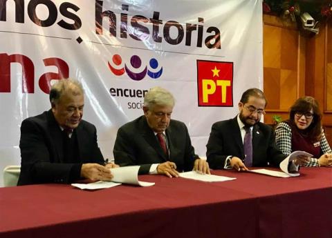 Los partidos Morena, PT y PES hicieron formal la mañana de este miércoles su convenio de coalición rumbo al proceso electoral de 2018, el cual llevará por nombre "Juntos haremos historia".